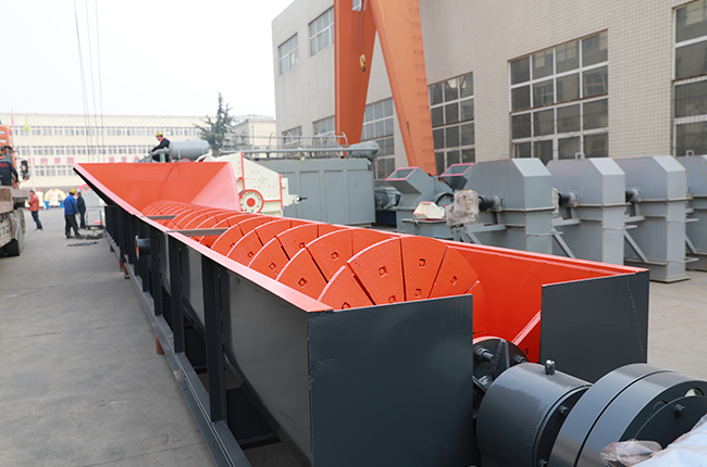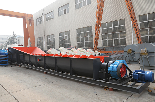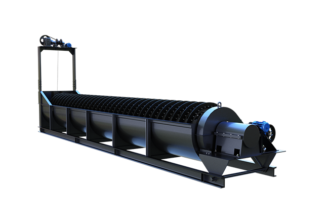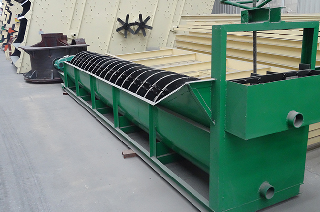 物料由給料箱均勻給入,連續給主槽體中注入一定量的水,傳動部帶動螺旋軸以一定的速度旋轉,迫使物料在槽體中翻轉滾動并向排料口運動,細粒級物料和雜質隨溢流水經溢流堰排出,粗粒度物料由排料口排出,從而實現物料的洗選、分級、除雜和脫水。