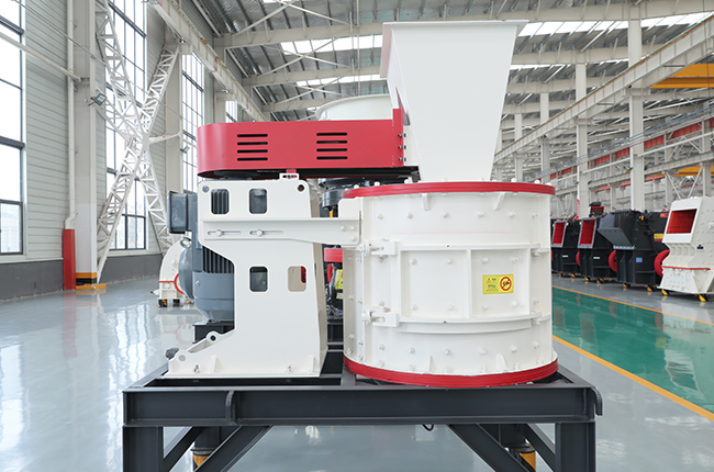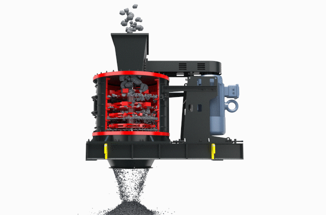 物料由設備上部垂直落入高速旋轉(zhuǎn)的葉輪內(nèi),在高速離心力的作用下,與另一部分以傘狀形式分流在葉輪四周的物料產(chǎn)生高速撞擊與粉碎,物料在互相撞擊后,又會在葉輪和機殼之間以物料形成渦流多次的互相撞擊、摩擦而粉碎,從下部直通排出,形成閉路多次循環(huán),由篩分設備控制達到所要求的成品粒度。