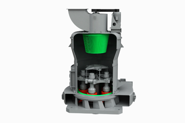 該機結構主要由主機、分析器、風機、成品旋風分離器、微粉旋風分離器及風管組成。其中,主機由機架、進風蝸殼、鏟刀、磨輥、磨環、罩殼組成。雷蒙機工作時,將需要粉碎的物料從機罩殼側面的進料斗加入機內,依靠懸掛在主機梅花架上的磨輥裝置,繞著垂直軸線公轉,同時本身自轉,由于旋轉時離心力的作用,磨輥向外擺動,緊壓于磨環,使鏟刀鏟起物料送到磨輥與磨環之間,因磨輥的滾動碾壓而達到粉碎物料的目的。