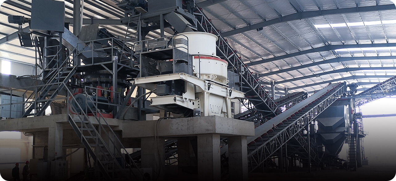 原料由料倉進入振動給料機,再送入顎式破碎機進行粗碎,粗碎后物料經(jīng)輸送機進入反擊破或圓錐破進行細碎,細碎后物料由輸送機送至振動篩進行篩選,不滿足制砂機進料粒度的被返回反擊破或圓錐破中繼續(xù)破碎,滿足進料粒度的物料被送入制砂機內(nèi)進行制沙。從制砂機出來的細料,再次進入振動篩內(nèi)進行篩分,篩分出滿足要求的砂子,進入洗砂機清洗,清洗后由成品輸送帶輸送至成品堆;不滿足要求的砂石混合物料,送入制砂機進行再次破碎。